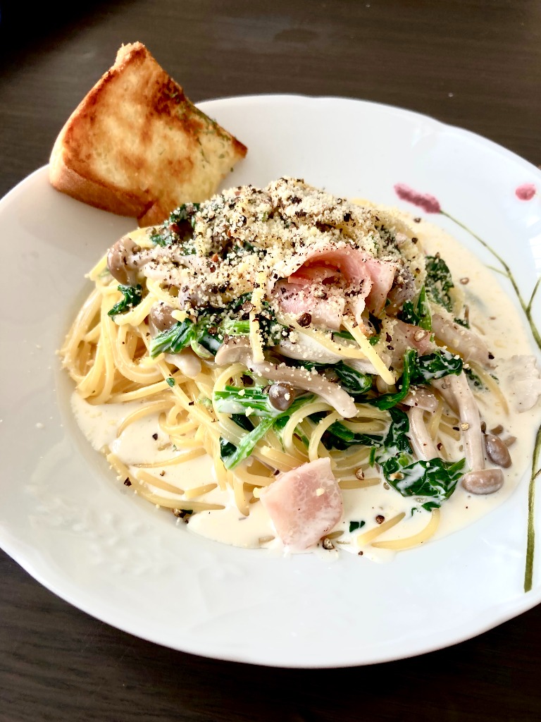 先日の一人ランチ、レンジで作るクリームパスタ。