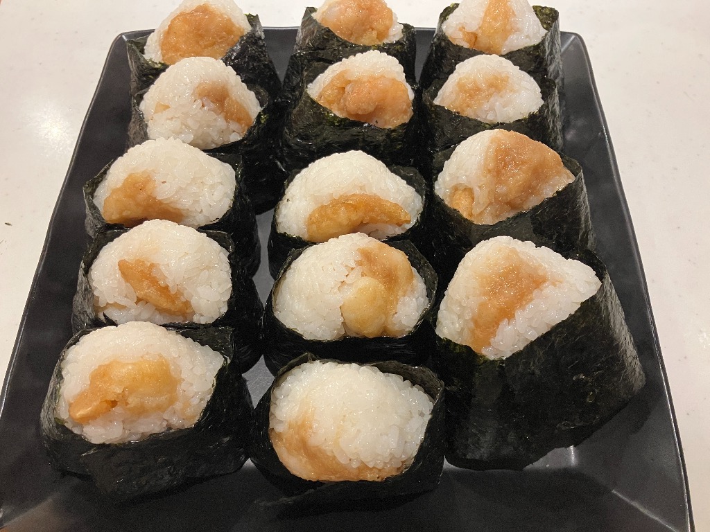 ちょこんとエビが乗ってる天むすは余計にぎっしり握ってしまう・・・