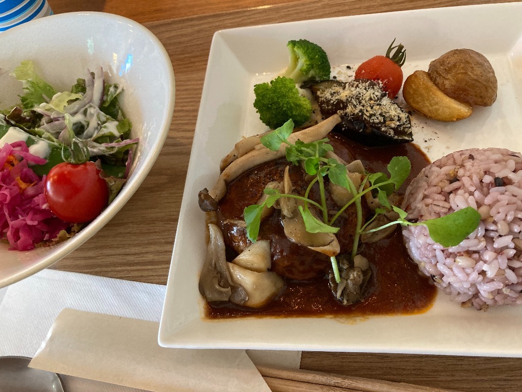 夫はフードコートが嫌いなのでレストランのほうでどこかいいところがないかと探していたらなんか健康そうなお店があり、夫はあまりお腹がすいていなかったようで中華そばをみてこれならいいかなと、私はがっつり定食食べたいなぁとかいいながら順番待ちをして中に案内されました。