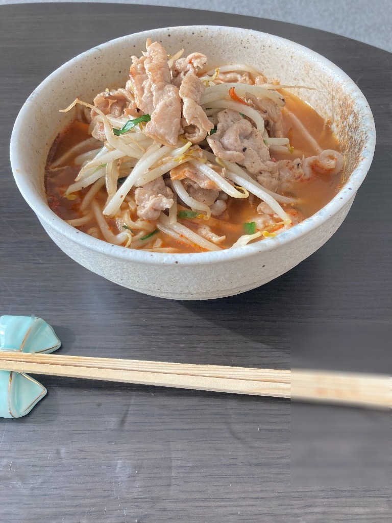 インスタントラーメンだけだと足りないので肉野菜炒めをいつも足します。